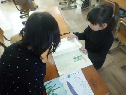 国語「ずうっと,ずっと大すきだよ」の学習で,自分の好きな場面・心に残った場面を選び,その理由をお友だちと交流しました。教科書の気に入った場面にシールを貼り,そこを見せながらお話をしました。自分と同じ場面を選んでいる人が少なくて,楽しい交流になりました。