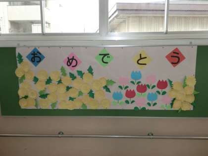 タンポポとチューリップの掲示やプレゼントのしおりも心を込めて作りました。本番の明日が皆待ち遠しい様子です。