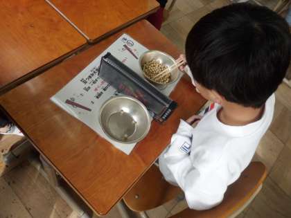 毎日の給食に感謝する「給食週間」の取組みの一つに,豆つまみ大会があります。正しいお箸の使い方を意識するために,大豆を一つひとつ上手につまむのですが,これがなかなか難しいです。今日は,来週18日に行われる「豆つまみ大会 低学年」の予選をクラスでおこないました。