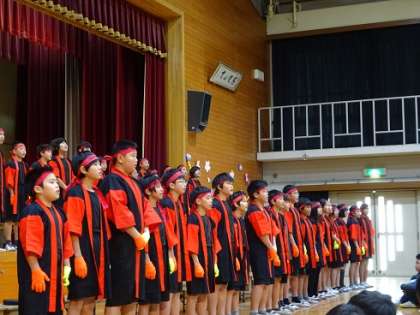 お礼に6年生は歌「友〜旅立ちの時に〜」と「IKEDAロックソーラン」を発表しました。