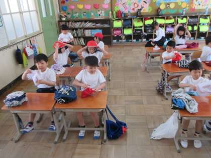 初めての体育の授業は,着替えのしかたからスタートしました。