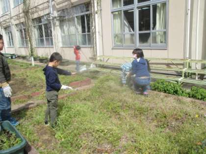 畑の草ぬきをし,苗を植える準備をしました。力を合わせてきれいにしました。