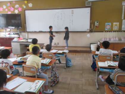 友だちと向かい合って,はっきりと名前を言える1年生です。