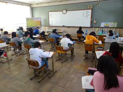 学力調査の問題に取り組みました。よく読まなければ答えにたどり着けない問題が多くありましたが,時間いっぱい集中して頑張っていました。