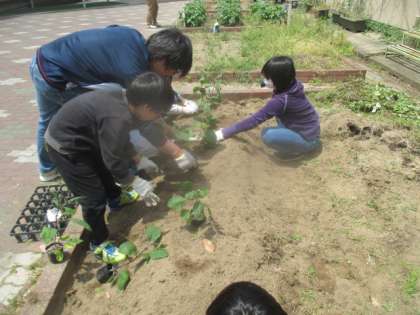 なすの苗を植えました。子どもたちは,早くも収穫を楽しみにしています。