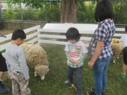 休み時間には,元気いっぱい!仲良く外遊びをしています。今日みたいなお天気の日は,外に出ると気持ちいいですね。初めはこわがっていた羊とも,仲良くなりました。