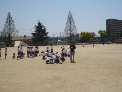 雲ひとつない晴れわたった空の下、子どもたちが50M走をしています。