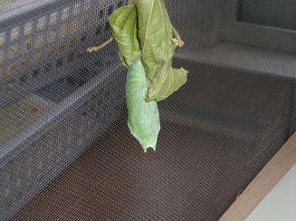 今年も黄緑色の大きなさなぎからきれいな紫色をしたオオムラサキが羽化し始めました。