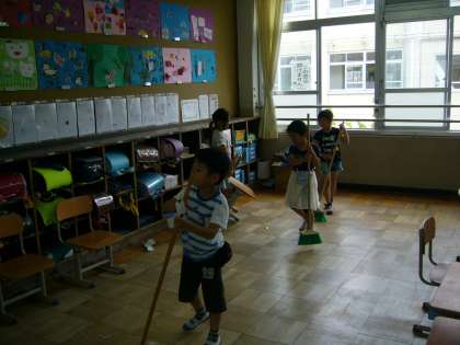 「みんなで力を合わせて,美しく。」1年生もがんばって掃除をしています。ほうきではく人,机を運ぶ人。自分たちの使う手洗い場もきれいにしています。