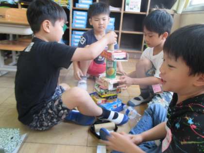算数の活動で,持ち寄った箱を使い,箱のかたちの特徴を生かして積み上げたり転がしたりとたくさん遊ぶことができました。