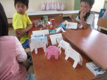 立ててみると,とってもおもしろい世界ができあがり,子どもたちはもくもくと作業して作品を作り続けていました。