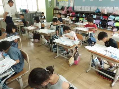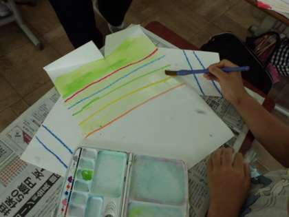 みんなが楽しみにしていた絵の具の学習。自分の好きな色を一色選び,水の量を調節しながら,色を塗りました。緊張しながら筆を動かしている姿が,とても可愛らしかったです。