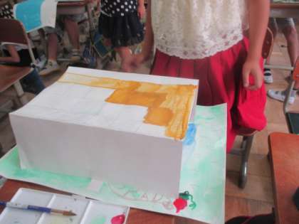 子どもたちは実際に画用紙を立てながら色を塗り,どうすれば立体的に見えるかを試行錯誤していました。