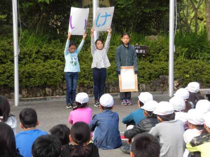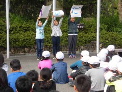 今朝は合同の朝の集いがありました。山の家の近くにいる動物を教えてもらったり,本校の児童代表が池田小学校の紹介をしたりしました。