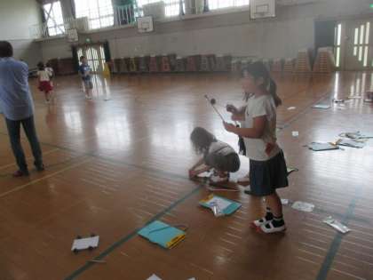 理科の「ゴムと風の力で物を動かそう」の単元で,輪ゴムの力で動く車を作りました。子どもたちは体育館で,ゴムをどれくらい引っ張ると,どれくらい走るのかを調べていました。楽しみながら,ゴムの性質を知ることができました。