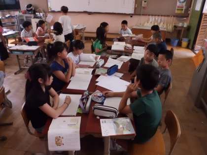国語の学習で新聞を作っています。 インタビューやアンケートを考えて,各班で話し合いながら新聞づくりを進めています。