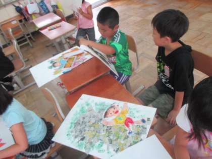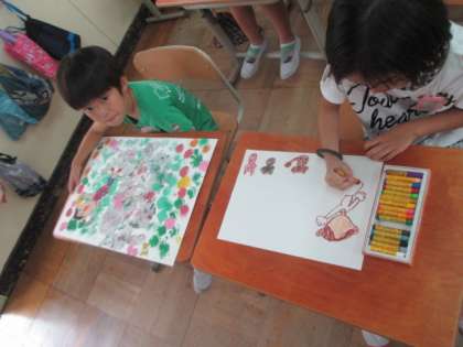 自分の姿や動物の絵をクレパスで描いてつけ加えて,完成しました。