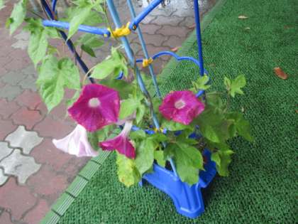 雨がよく降る毎日ですが,1年生の育てているアサガオの花が次々に咲いて,とてもきれいです。