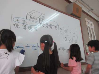 「一億までの数」の単元で,3年生には量感をつかむことが難しく,イメージしにくいようですが,友だちの話を一生懸命に聞き,理解しようとする姿勢が見られました。