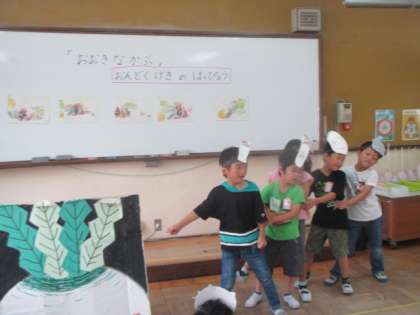 1学期のしめくくりに,国語「おおきなかぶ」の音読劇の発表会をしました。