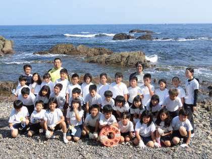 海を背景にみんなで記念撮影です。