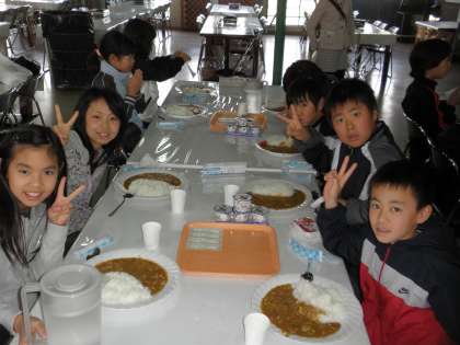 子ども達は,もうお腹がペコペコ。到着して記念撮影をしたら,まずは昼食のカレーをいただきました。
