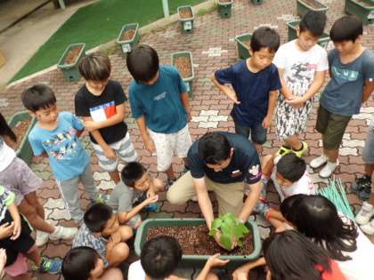 9月13日(金)に食育の学習で京都青果合同株式会社の方や,宮崎県の経済連合会の方に来ていただき,ピーマンの苗を植えました。2時間の授業でしたが,ピーマンの花や出荷量などに関するクイズを出していただき,子どもたちも楽しく学習したり実際にピーマンの苗を植えたりと楽しく学習することができました。1つの苗に50個ほどのピーマンを収穫できるそうです。