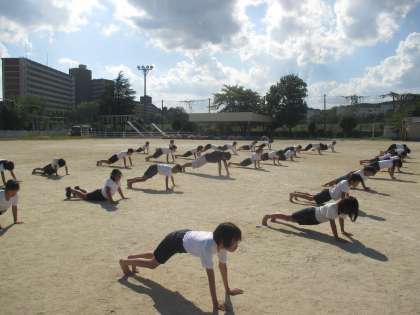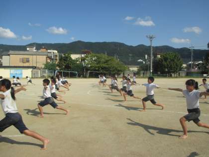 強い日差しの中,暑さ,そして石などの痛さを乗り越え,子どもたちは,一人技から全員技まで成功させることができるようになってきました。