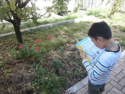 あきみつけ2回目の今日は,「植物はかせになろう」ということで,図鑑を持って出かけました。