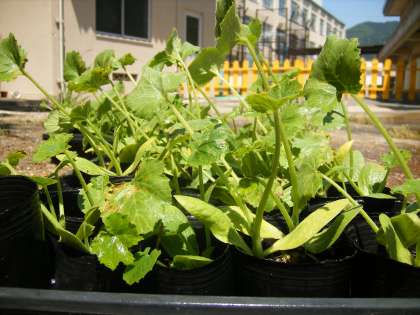 これが,ズッキーニの苗です。5年生が種をまいてから,約1ヶ月ほどたちました。温かい日差しをあびて,ぐんぐん元気に育っています。