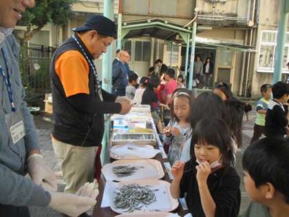 5年生の出前授業に来てくださっていた市場の人に,新鮮なお魚を見せていただきました。