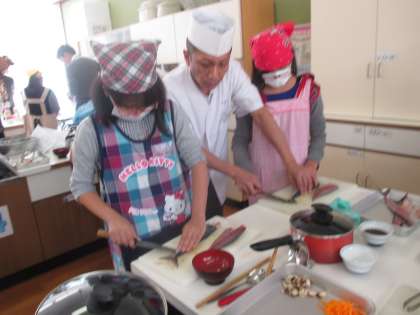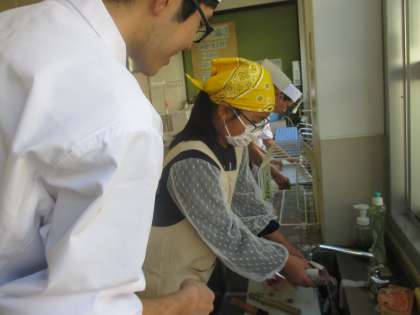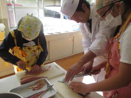 そして,家庭科室に移動し,いよいよプロの料理人から,サバを三枚におろすやり方や,料理の作り方を教わりました。