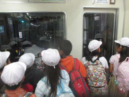 秋の校外学習で,八ツ橋工場へ行ってきました。雨でしたが電車に乗った時からウキウキしていました。