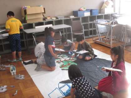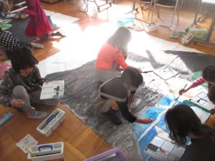 学習発表会の音楽劇で使う背景を子どもたちが色を塗っています。1つ目の背景が完成して,本番が近づいていると実感していました。