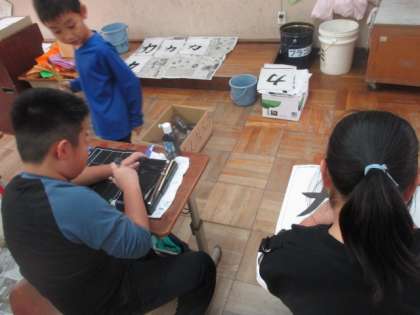 書写の時間に「おれ」と「はね」の筆使いを学習しました。「はね」が難しかったようですが,力強い字を書いていました。