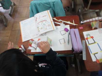 算数の「重さ」の単元で,てんびんを作り,物の重さを比べました。筆箱の中に入ってあるものの重さを全部測ってみる子もいました。