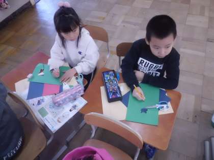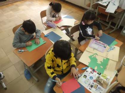 切った画用紙を別の画用紙の上に重ねて色を塗ります。