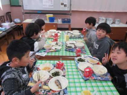 久々のランチルームでの給食に興奮気味の1年生でした。