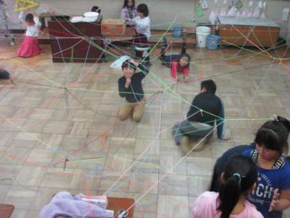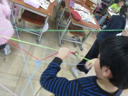 図工の「ひもひもワールド」の単元で,教室にひもをたくさん括り付けました。