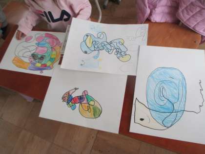 自由に描いた線の形から,「何に見える?」「何かかくれてる?」と,想像力をはたらかせて色を塗りました♪