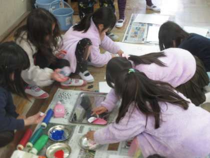 図工の「いろいろうつして」の単元で,版画をしました。緩衝材やキャップ,櫛を使って作品を作っています。どんな作品が出来上がるか楽しみです。