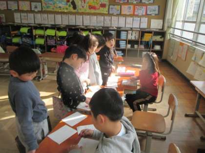 お客になるとき,お店側になるとき,どちらも,1年生なりの言葉づかいやその場に応じた話し方でコミュニケーションがとれていて面白かったです。