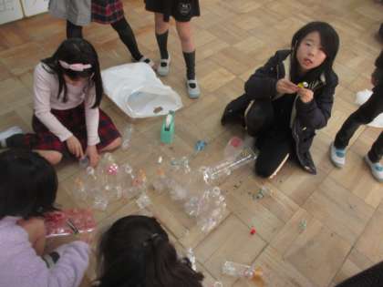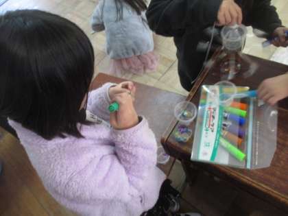 図工「クリスタルファンタジー」の単元で,光を通すものを使って,町を作っています。色を塗ったり,色水を使ったりと綺麗になる工夫を考えながら作っています。
