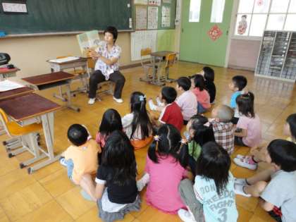 今日は、二つある日本語教室のうち、中国語を勉強するほうの教室に来てくれました。教室には、中国語の絵本がたくさんあります。みんなの知っている「アラジン」や「ライオンキング」もありましたね。日本語で書かれた中国のお話「王さまと九人のきょうだい」の読み聞かせを楽しみました。みんな、次々と出てくる登場人物を言い当てていましたね。