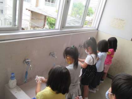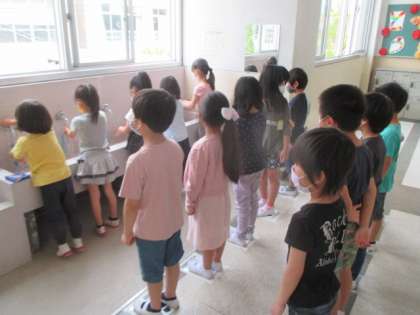 今年度はいつも以上に手洗いが大切になります。今日は,手洗いの仕方を練習しました。みんな上手に手洗いができました!待つときも,床に書いてある足型マークの上で,静かに待てましたよ。