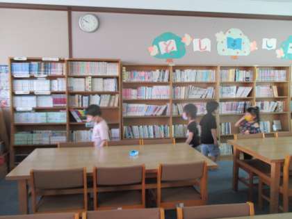 Bグループは、学校たんけん「図書館たんけん」をしているところです。