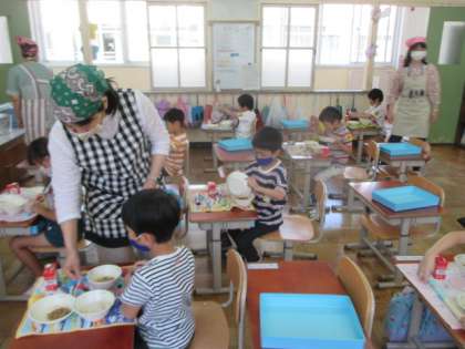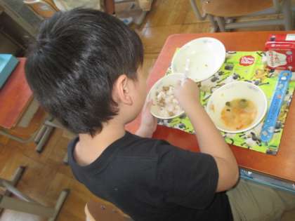 今日は、Aグループのはじめての給食でした。朝から自分の給食袋を嬉しそうに見せてくれる人がいましたよ。初日のメニューは,「おからさばどんぶり」と「トマトだご汁」でした。聞きなれない献立でしたが、「おいしい!」と好評でした。「だご」とは団子のことです。もちもちした団子が気に入ったようでした。なんと、みんな時間内に完食でした!