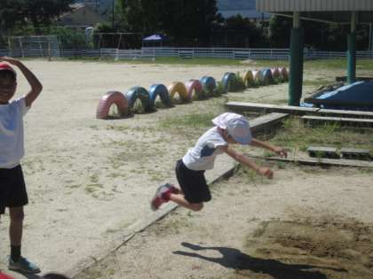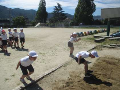 体育の時間に立ち幅跳びをしました。しっかりと腕をふって跳ぶことを意識して取り組みました。