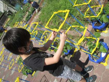 大事に育てているあさがお。よく見ると、葉っぱの間から「つる」が伸び始めています。これからどんどん大きくなるでしょうね。つるが上手にからむように、支柱をたてました。