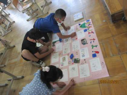 達成感いっぱいの学校探検の思い出を模造紙に貼って集めました。